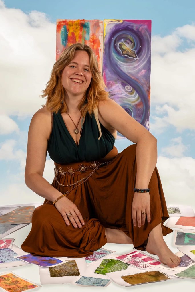 Hai! Ik ben Moon en sinds 2023 heb ik mijn vleugels uitgeslagen naar een nieuw avontuur hier in Heerhugowaard. Ik hou van ’t motto: “Het leven is een feestje en je hangt zelf de slingers op” In mijn beeldende kunstpraktijk werk ik graag met persoonlijke thema’s. Ik kan mij al geïnspireerd voelen door een mooi gesprek, mooie levensles of juist het simpele in het alledaagse. Kleur geeft mij daarom een intuïtieve vertaalslag naar het papier en elke keer zijn mijn resultaten weer anders.